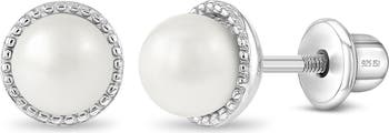 An elegant and timeless pair of white simulated pearl screw back stud earrings for babies, little girls and children. Finely crafted entirely in 925 sterling silver and simulated pearls, they are hypoallergenic and safe for children with sensitive ears.They feature a threaded earring post and back to ensure your child's earrings stay safely and comfortably in place. A complimentary gift box is included.