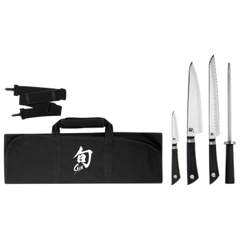 The Shun Sora 5-Piece Student Set includes the Shun Sora 8-in. Chef's Knife, the Sora 3.5-in. Paring Knife, the Sora 9-in. Bread Knife, 9-in. Combination Honing Steel, and a sturdy Shun 8-Slot Knife Roll for carrying them to and from class. The handsome nylon knife roll is embroidered with the Shun logo and includes space for up to eight knives. It folds up compactly for easy carrying.