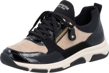 Glossy patent trim adds a flash of modern intrigue to a comfort-focused sneaker grounded by a cushioned insole.