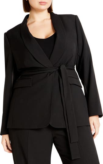 A tie belt defines the waist of this polished jacket kissed with comfortable stretch.