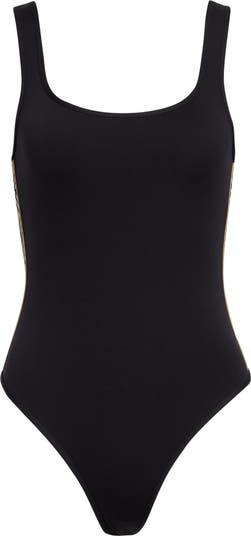 The iconic checks trace the side seams of this one-piece swimsuit cut in a classically scooped silhouette and subtly tagged at the front with a tonal Equestrian Knight.