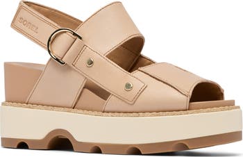 Adjustable leather straps enhance the comfort of a soft wedge sandal cushioned by a contoured footbed and boosted by a lugged platform sole.
