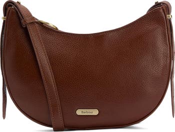 Finely grained leather and aged-finish hardware bring rich texture to a crescent-shaped sling bag featuring a signature plaid lining and adjustable crossbody strap.