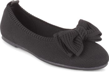 A breathable knit upper and cushioned footbed bring wear-all-day comfort to this sweet ballet flat topped with a bow.