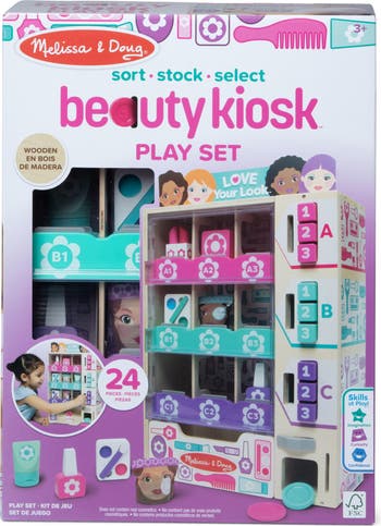 Kids can sort, stock and select "beauty products" from the wooden vending machine, then insert play coins and make a selection by pressing the corresponding button so items fall into the collection drawer.