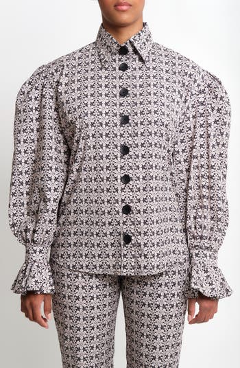 Sharp tailoring takes a romantic turn in this stretch-cotton poplin shirt framed with sculpted puff sleeves set off by the generously flounced cuffs.
