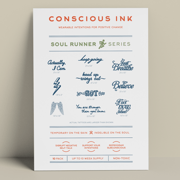 "I placed third female finisher at yesterday's marathon! I kept repeating in my head 'you're stronger than you know' and that helped me get to the finish line." ~Sara "Applied them Saturday night, did a triathlon Sunday morning, swam again this morning, took two showers and they still look fresh. Totally love them." ~Rhonda "Thank you for your awesome company. You make me stronger." ~Mar Empower your mind, heart, and soul, to give your legs a little extra lift. Let our Soul Runner Athletic Performance Kit support you, and your runner friends. Soul Runner Manifestation Kit includes: - 10 Manifestation Tattoos: (keep going, actually I can, head up wings out, just breathe, believe, lightning bolt symbol, you got this, wings symbol, you are stronger than you know, if not now, when?) -1 "Set A Conscious Commitment" Worksheet (Will support you in making a clear commitment, and identifying the steps you can take to stick with it.)