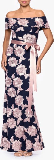 Dimensional floral designs blossom on this elegant and modern off-the-shoudler gown complete with a silky ribbon tie at the waist.