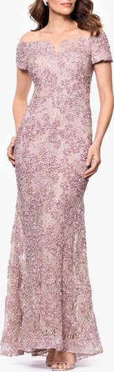 Swirled in soutache lace and made to show off you shoulders, this floor-sweeping gown is perfect for your next formal occasion.