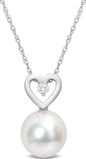 This unique drop pendant is mounted in luminous white gold. This captivating pendant features a South sea cultured pearl and a prong and channel-set diamond placed on top of the pearl in an open heart motif. Enhanced with a high polished finish, this flawless pendant is suspended on a 17-inch rope chain. Compliment your favorite black dress with this lovely necklace.