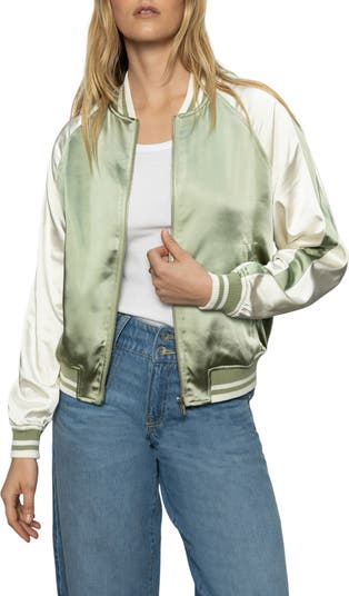 Smooth satin puts a fresh spin on this classic varsity jacket finished with crisply striped ribbing at the cuffs and hem.