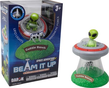 SPACE ADVENTURE BEAM IT UP ALIEN TOY - Prepare for a cosmic encounter like no other with the Space Adventure Beam It Up with Alien Toy! This hilariously fun set combines out-of-this-world adventure with imaginative play. Featuring an alien in a futuristic spacecraft, a cow enjoying its pasture, and a lifting cone, this set is full of interactive surprises. Activate the spaceship’s lights and sounds, then push the button to watch the alien beam up the unsuspecting cow in a gravity-defying abduction! The gravity-defying motion adds a thrilling, interactive element to the play, making kids feel like they’re in the middle of a UFO abduction mission. It’s the perfect toy for sparking creativity, laughter, and storytelling. Whether it’s alien experiments or interstellar cow adventures, this set will keep kids entertained for hours. Kids can recreate their own cosmic encounters or imagine brand-new alien adventures in the comfort of their own space! Ideal for ages 3 and up, it’s a playful addition to any young explorer’s toy collection! INCLUDES: (1) Alien, (1) Cow, (1) Spacecraft.