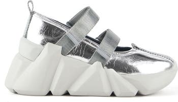 The Space Kick Jane is a bold take on the classic Mary Jane. It features a sleek leather upper with two adjustable straps across the vamp and a robust, sculptural outsole. The Space Kick silhouette derives from United Nude's Lo Res design language, offering a low-resolution twist on the retro-athletic sneaker. This unique approach involves re-designing objects by progressively lowering their 3D resolution, resulting in more fragmented and abstract forms with each step. This distinctive, low-resolution aesthetic has been applied to various products, including shoes, cars, and furniture, making it a signature style of the brand.