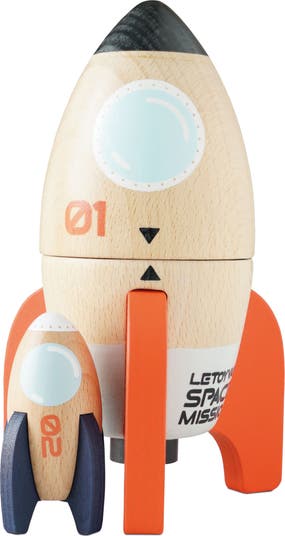 Introduce little ones to the whimsy of wooden toys with this beautifully painted space rocket set that allows the smaller one to fit in the larger ship.