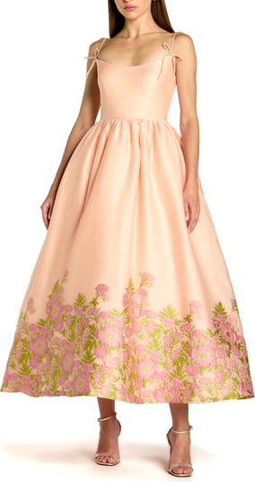Organza A-line dress with a scoop neckline, spaghetti straps with bow detail, and embroidered trim along the hem.