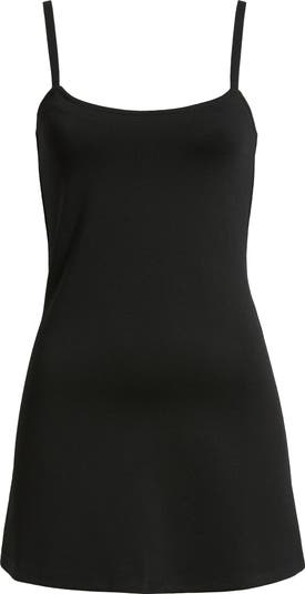 A minimalist silhouette and slender straps define this A-line minidress with understated allure.