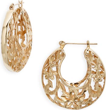 A vining floral cutout design makes texture blossom in these hoop earrings plated with 24-karat gold.