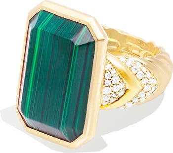This bold cocktail ring from the Spark Collection features a custom emerald cut shape in malachite combined with striking pave-set diamond detailing. It features a stunning solid piece of malachite cut by hand and meticulously set into a 14k gold bezel. The wide band features signature ribbing in a chevron pattern for a textural and dramatic effect.