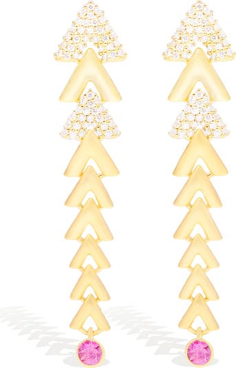Created for subtle and sophisticated movement, the 14k gold chandelier earrings from the Spark Collection are hand-built with individual chevron links that taper in size for an elegant shoulder duster design. A bezel-set pink sapphire compliments each earring and diamond chevron links for an elegant and edgy effect.