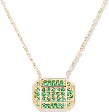 A charm necklace that is versatile enough to stack and, bold enough to wear alone, the Spark Emerald Cut Charm Necklace glitters with pave-set emeralds completely covering the emerald cut shape. Anchored by a 14k gold diamond cut cable chain, this piece features chevron detailing on the back for a pendant that delivers unique design elements throughout.
