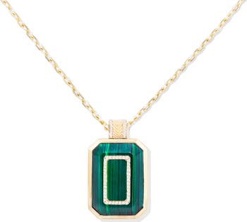 This bold pendant from the Spark Collection features a custom emerald cut shape in malachite combined with striking pave-set diamond detailing. It features a stunning solid piece of malachite that is cut by hand and dimensional in the front as well as the back. Anchored by a 14k gold diamond cut cable chain, the bail is decorated in signature ribbing details with a chevron pattern for a delicate and textural look.
