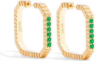The octagon-shaped hoops in the Spark Collection utilize geometric motifs to create an unexpected alternative to your traditional hoop earring. Embellished with signature etching throughout and adorned with six beautiful diamonds, these 14k gold hoops combine a classic silhouette with modern details.