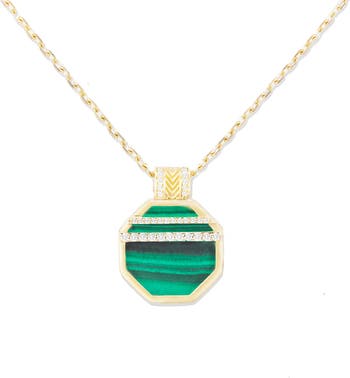This bold, octagon-shaped pendant from the Spark Collection combines custom hand-cut malachite inlay with pave-set diamonds for a unique and striking look. Anchored by a 14k gold diamond cut cable chain, it ties in signature ribbing details with a chevron patterned bail, for an understated but dramatic effect.