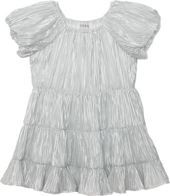 Add a little sparkle to any occasion with the Sparkle & Spin Dress. This silver-tiered beauty features a crinkled metallic finish that shimmers with every twirl. Designed with puffed sleeves and a gathered round neckline, it?s perfect for making a statement at parties or dress-up adventures. Light, playful, and full of shine, this dress is magic in motion!