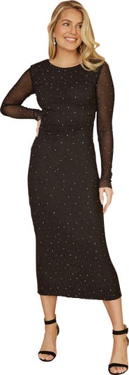 Looking for an absolute slay show stopper for party season? Look no further! This bodycon mesh dress features a cut out back with tie fastening, all over diamante studs and midi length. Elegant and seductive for a head turning fit this season!