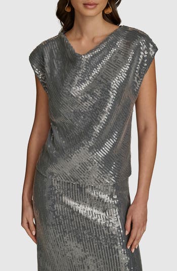 Travel with your own spotlight everywhere you go in this gracefully draped top that's dripping with allover light-catching sequins.