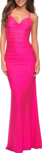 Pretty neon pink long jersey prom dress with sparkly rhinestones throughout fabric. Draped V neckline and hook and eye back criss cross straps. Back zipper closure.