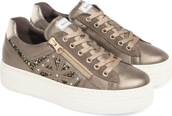 Polished studs and glitter-encrusted insets add hints of glam to a low-profile sneaker fastened with side zippers and lifted by a chunky platform cupsole.