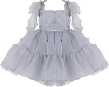 A dazzling choice for magical moments—this shimmering silhouette blends soft movement with elegant detail, perfect for parties, pageants, or winter celebrations. Glitter-embellished bodice with flutter sleeves and rhinestone trim. Voluminous tiered skirt with soft ruffles and a fairytale finish.