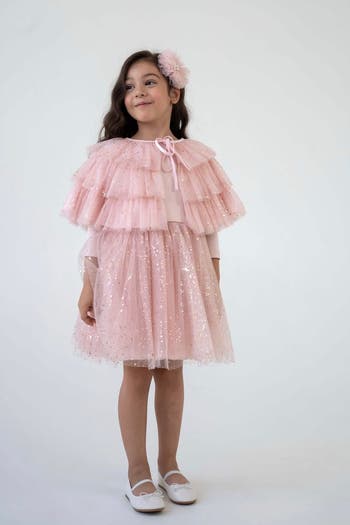 Sparkle Pink Dress Set is designed to give little princesses an elegant and charming look. With a rose gold foil printed skirt, the Sparkle Pink tutu dress sparkling in every detail. The cape in this set offers elegance with layered ruffle details and cotton lining.