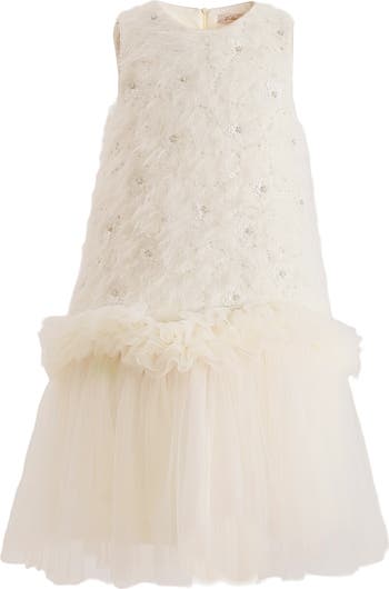 Sparkling yet serene, this sleeveless dress features a textured bodice with subtle sequins and a whimsical tulle skirt. It’s a polished pick for festive gatherings. Floral-appliqué bodice with tiny sequins and flared tulle skirt.