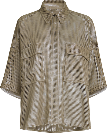 Sparkling leather is a refined material that, thanks to a sophisticated dyeing process, features a slightly metallic effect finish. The net-like structure is the result of a laser-cutting process.