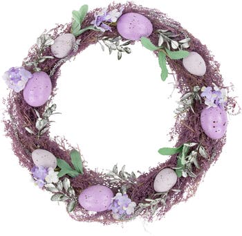 Add a touch of springtime charm to your home decor with our lilac and lavender speckled egg Easter wreath. Handcrafted with care, this wreath features a collection of delicate twigs adorned with preserved purple foliage, creating a and natural feel. Nestled among the twigs are charming speckled eggs in varying shades of pastel purple, adding a pop of color and whimsy to your space. Hang this wreath on your front door, above your mantel, as a centerpiece on your dining table or anywhere you want to add a touch of Easter cheer. Perfect for the season, this wreath will bring joy to all who see it. Product Features: Purple and lavender speckled egg wreath Soft, preserved purple foliage and twigs fill the wreath Accented with tiny purple and white silk flowers with assorted green leaves Natural twig backing for hanging Handle with care Recommended for indoor use - if using outdoors place under a covered area No assembly required - wreath comes in 1 piece Dimensions: 12" diameter x 3" deep Material(s): wood/foam/polyester