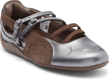An extended topline bridged with adjustable straps and bands of soft elastic brings a ballet-inspired silhouette to a racing sneaker that still maintains the low, streamlined profile that made it an icon. An aerodynamic Formstrip floating against the open side and a PUMA Cat embroidered on the toe keep the pedal to the floor for a fan-favorite win.