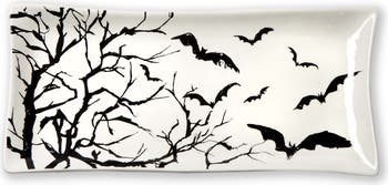 Create a Halloween and stylish tablescape with this Spellbound Rectangular Platter. Made from earthenware, this platter features a dramatic black and white design with spooky black branches and bats.