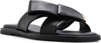 A logo-engraved metal bar brings signature polish to a striking slide in supple leather.