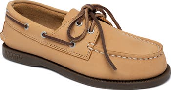 Traditional detailing makes an easy favorite of a kid-sized boat shoe made from premium leather with rawhide laces and signature wave-siped tread.