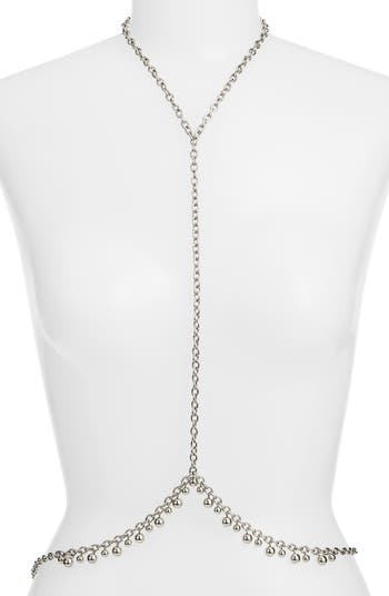 Add a bold element to your accessory routine with this lengthy body chain accented with sphere charms dangling at the waist.