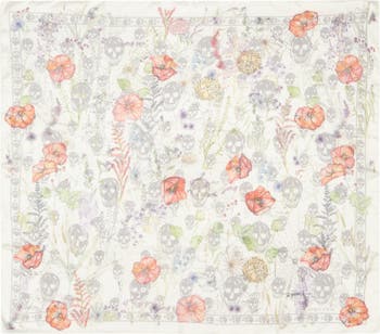 McQueen's macabre edge reigns supreme in this featherweight Italian-silk chiffon scarf, where vivid flora, signature skulls and spindly spiderwebs intertwine in a hauntingly beautiful tableau.