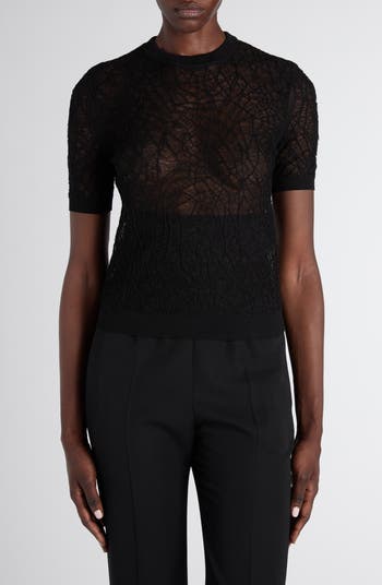 A lacy, semisheer jacquard resembles spidery cobwebs for a bit of McQueen edge on this short-sleeve sweater knit from a soft cotton and silk yarn.