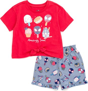 Are your Spidey senses tingling? Get your hero ready for an exciting action-packed comic book adventure in this cute and comfy Marvel Comics outfit! This stylish knotted short sleeve tee and ruffle hem chambray shorts set features vibrant colors and cool graphic art of your kid's favorite Spider-Verse superheroes Spiderman, Miles Morales, and Spider-Gwen with a fun ice cream design! Made of a soft material that keeps your child comfortable all day long, this fashionable Spiderman outfit is perfect for your Marvel fan!