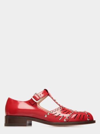 Inspired by an archival sandal from 1945, this Spiegel t-strap shoe features an upper in red calfskin decorated with palladium-hue studs and exacting openwork. A buckle sits to the side of the strap, engraved with the Bally logo.