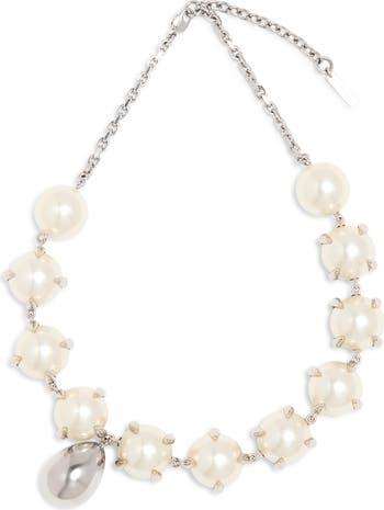 Luminous faux pearls are held by spiky silvertone prongs on this lovely necklace accented with a pear-shaped metal pearl for an asymmetric look.