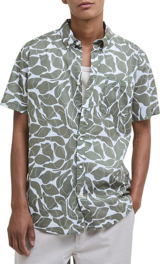 Spillroad Leaf Print Short Sleeve Cotton Button-Down Shirt