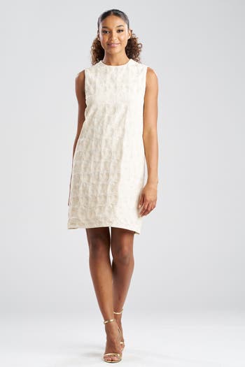 All over geometric embroidery on the shift style dress. This creates a unique and intricate look.