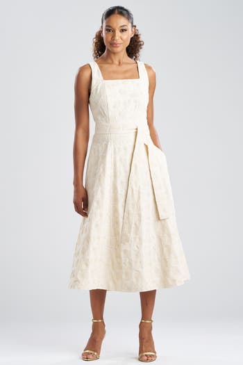 All over geometric embroidery on the square neck dress. This creates a unique and intricate look.